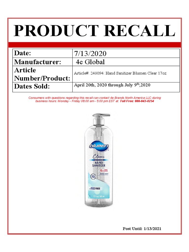 4e Brands North America Issues Nationwide Voluntary Recall ... from www.safemedicines.org Check spelling or type a new query. We did not find results for: Maybe you would like to learn more about one of these? Hand sanitizer recall brands 2020.